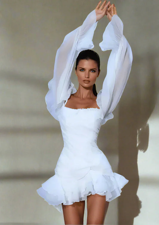 Regular price $85.00Regular priceUnit price / perSale price $85.00halter necklong sleevemeshminimini dressnewnew inoff the shoulderruffleruffle dressruffledsheersummervacationwhitewhite dress -