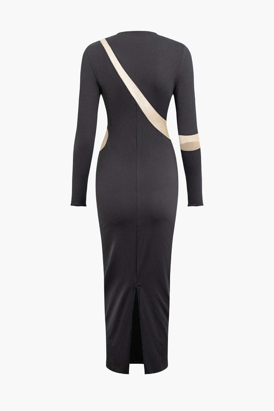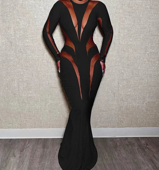 Luxe Long Sleeve Elegant Mesh Insert Bodycon Maxi dress