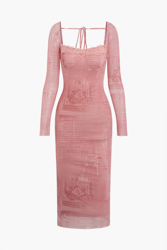 Pink Newspaper Print Long Sleeve Tie Backless Midi Dress