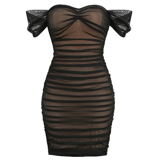 Off The Shoulder Mesh Ruched Midi Bodycon Dress