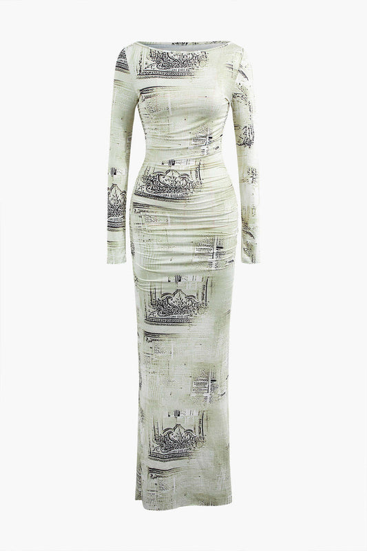 Elegant Long Sleeve Print Slit Bodycon Maxi Dress