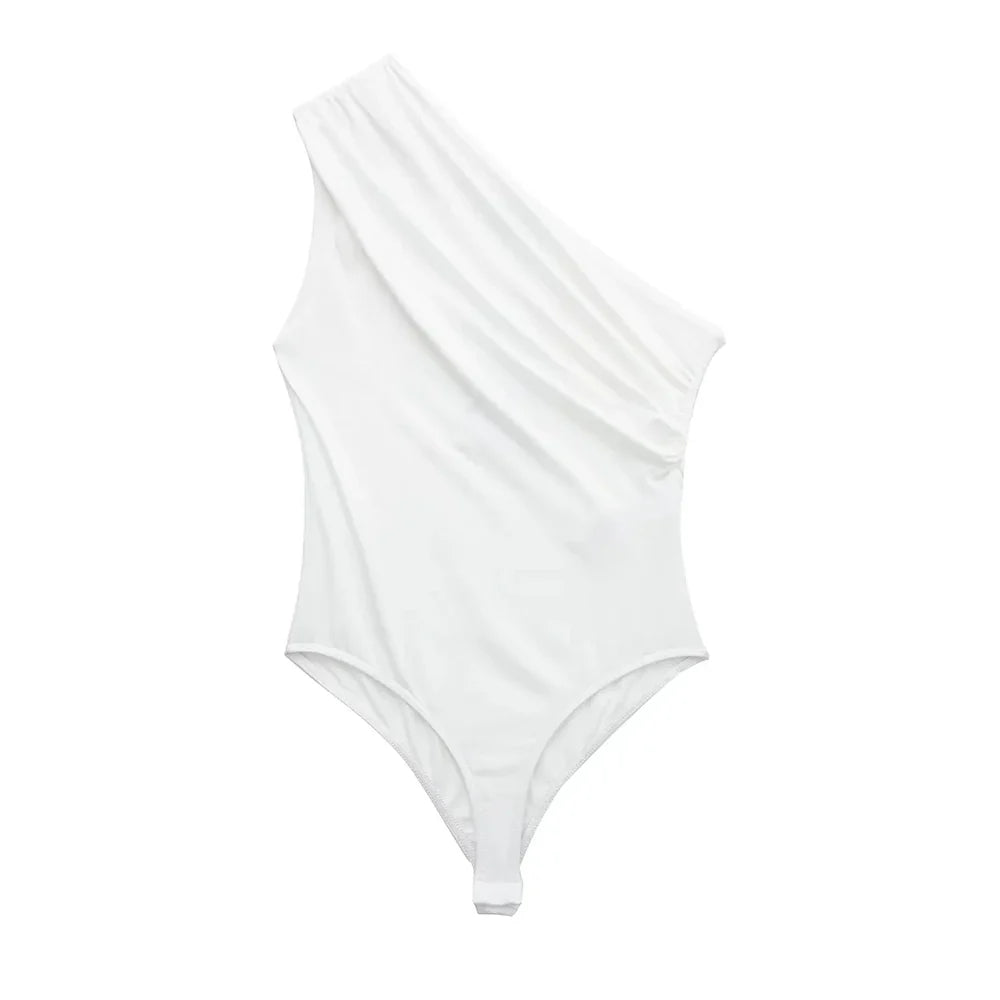 Discover the versatility and comfort of our Basics Ruched Asymmetric One Shoulder Bodysuit, perfect for any season! With slight stretch and a solid pattern, this bodysuit offers a flattering and skinny fit that will enhance your figure. Elevate any outfit with this must-have item.