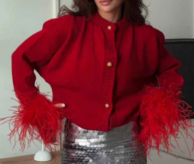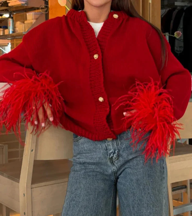 Stephanie Martin June 5, 2024Verified BuyerSuper cuteI wore this to a music festival and it was super breathable comfortable and stretchy. 100% would Recommend!Eline Red Feather Sleeve Knitted Cardigan Was this helpful? 0 0