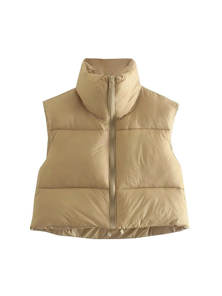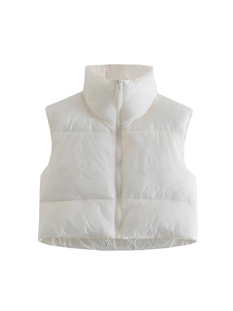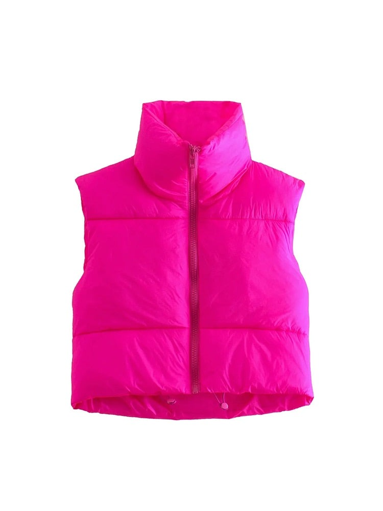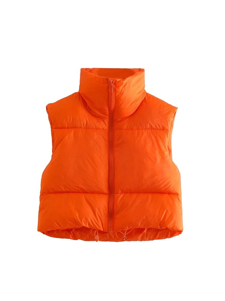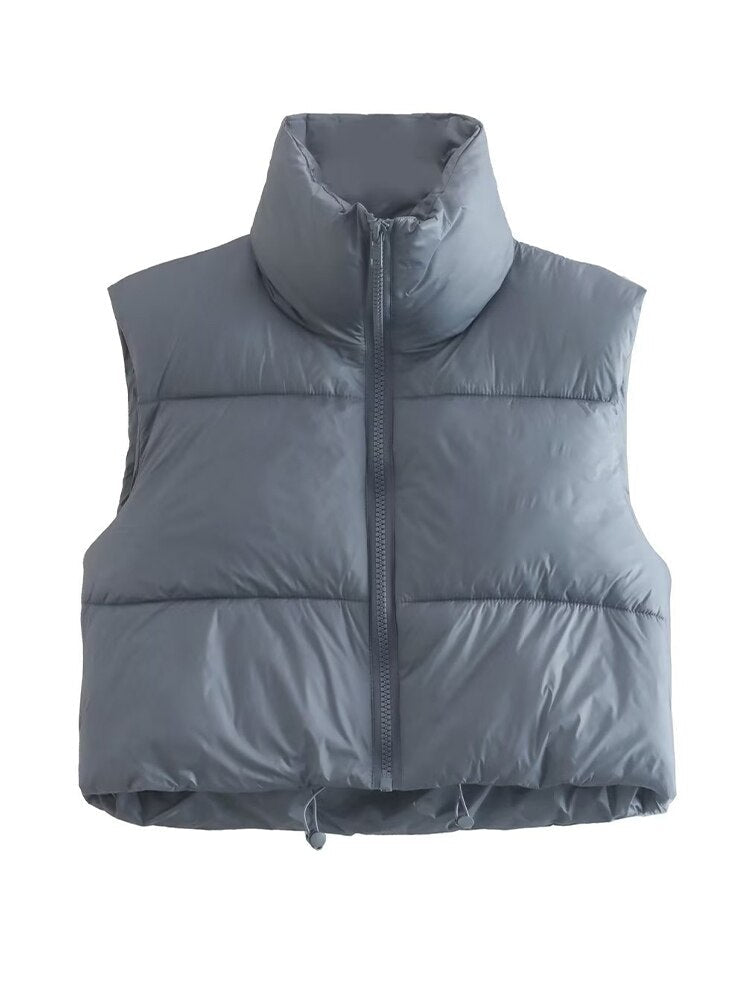 The High Neck Padded Cropped Gilet features a high street style and is crafted from a combination of polyester and cotton for a cozy and breathable wear. The zipper closure ensures a secure fit, blocking out the chill.