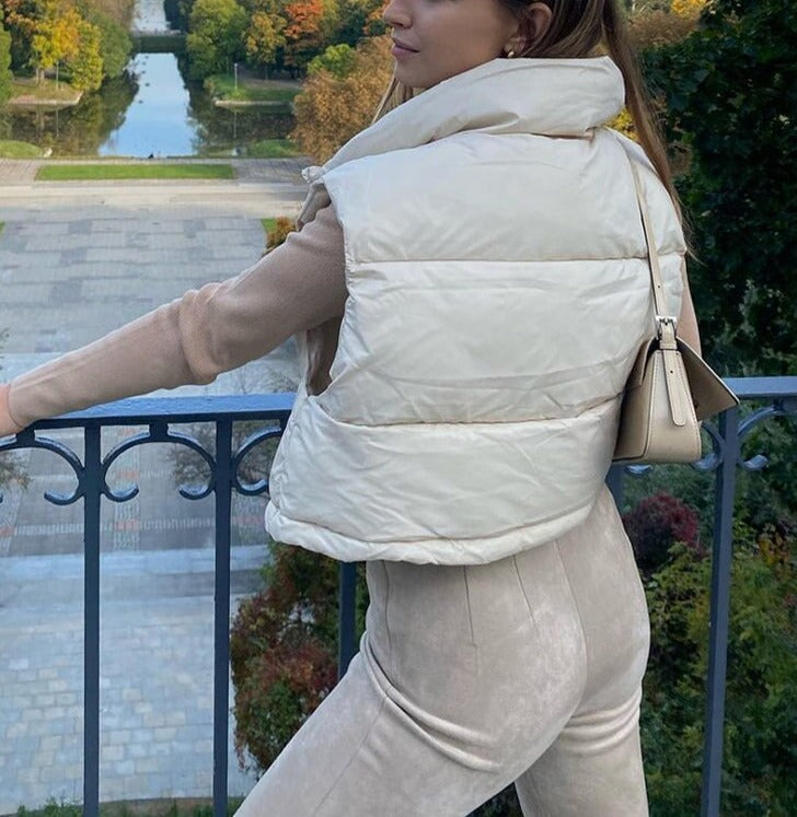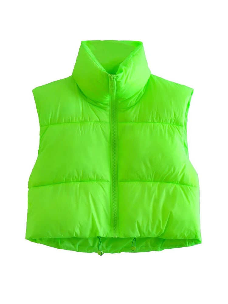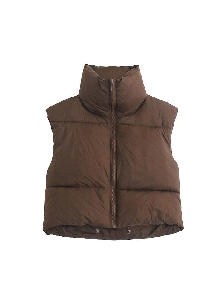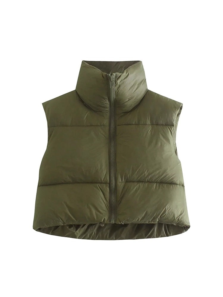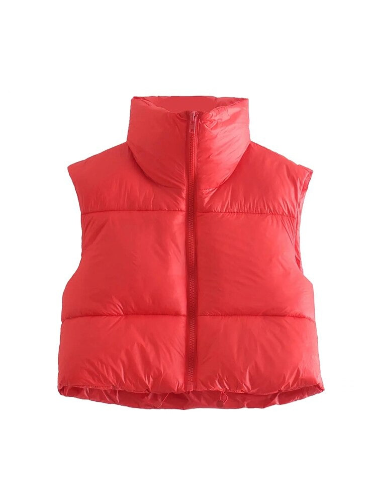 The High Neck Padded Cropped Gilet features a high street style and is crafted from a combination of polyester and cotton for a cozy and breathable wear. The zipper closure ensures a secure fit, blocking out the chill.