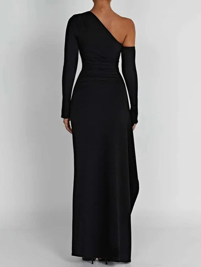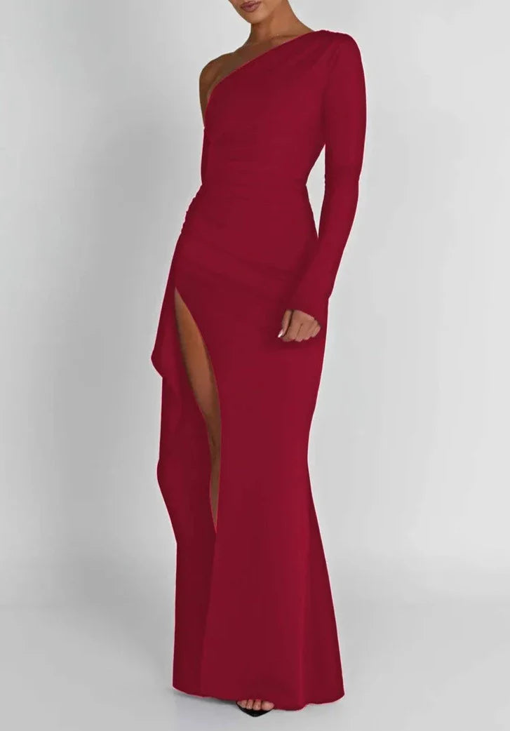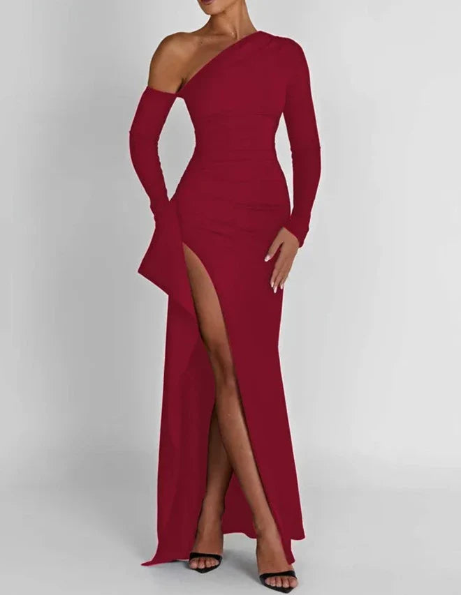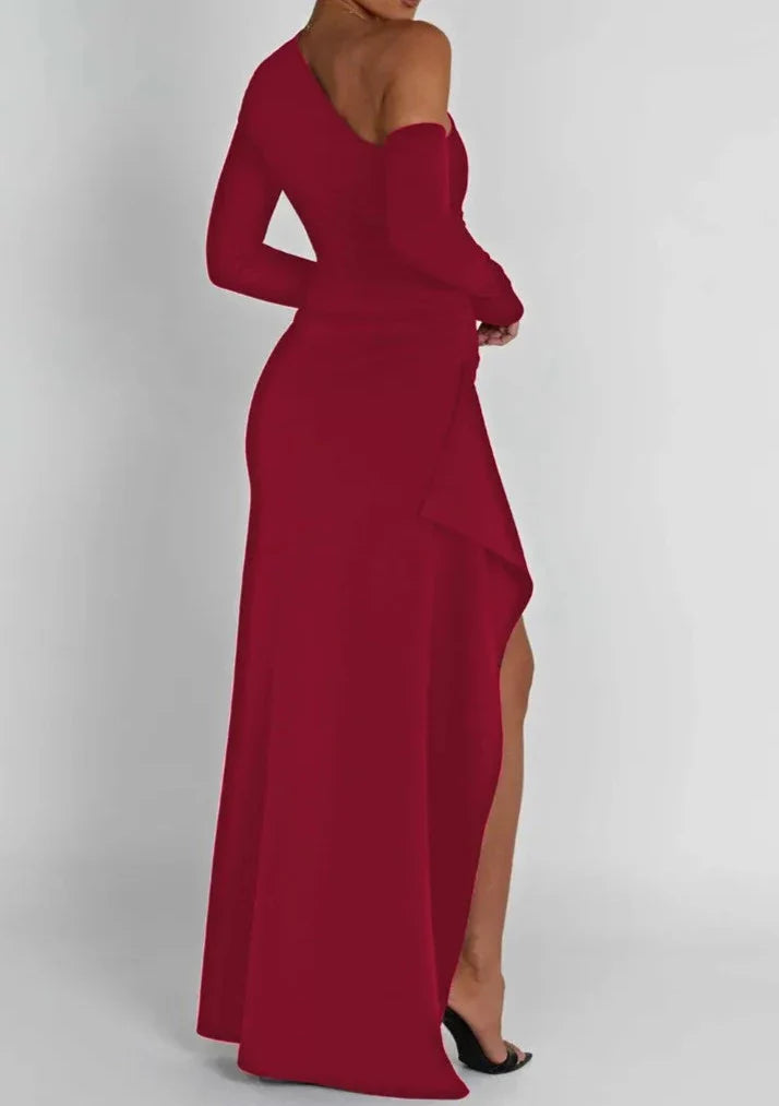 Luxe Oblique Shoulder Thigh High Split Maxi Dress