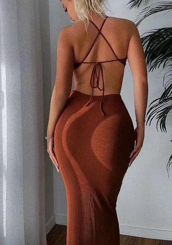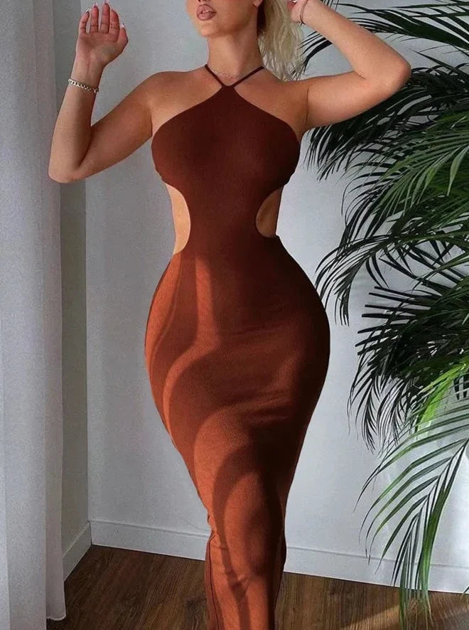 Be fearless in Ribbed Backless Halter Maxi Dress! Crafted from figure-hugging knit fabric, this sultry halter neck design features an ankle-length cut with slight stretch, alluring hollow out detailing, and a risk-taking silhouette.