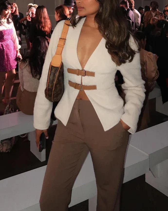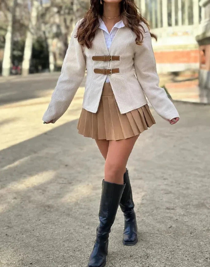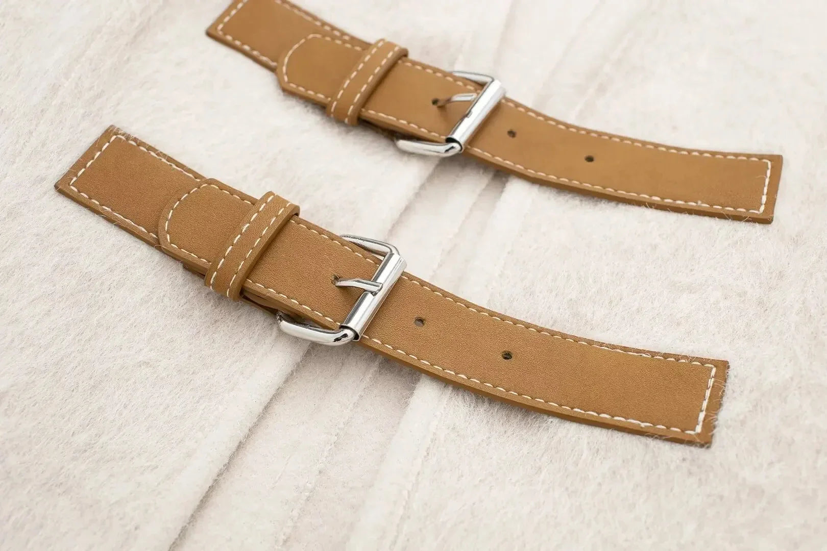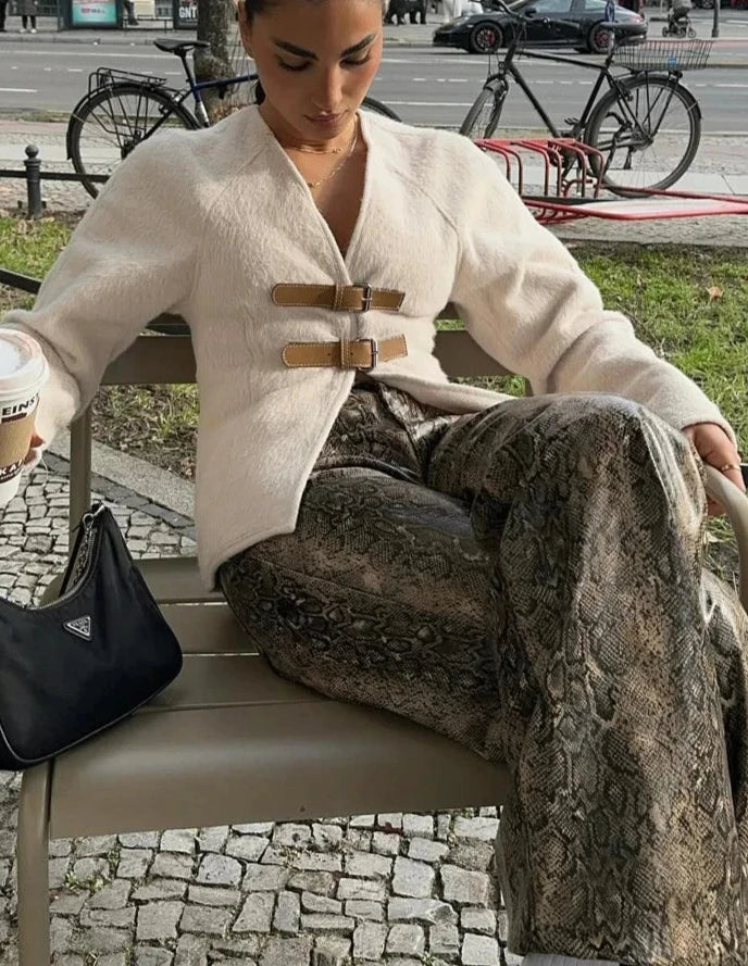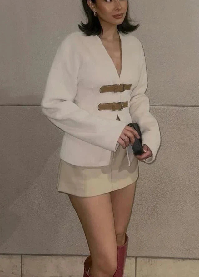 Indulge in the luxurious sophistication of the Vintage Leather Buckle Woolen Jacket. This opulent coat boasts an elegant white leather finish, a single-breasted closure, and long sleeves for a timeless and refined look. Perfect for the discerning lady who appreciates the finer things in life, this jacket is the epitome of high-end fashion. As a true work of art, it will elevate your spring sweater collection and make a statement as outerwear.