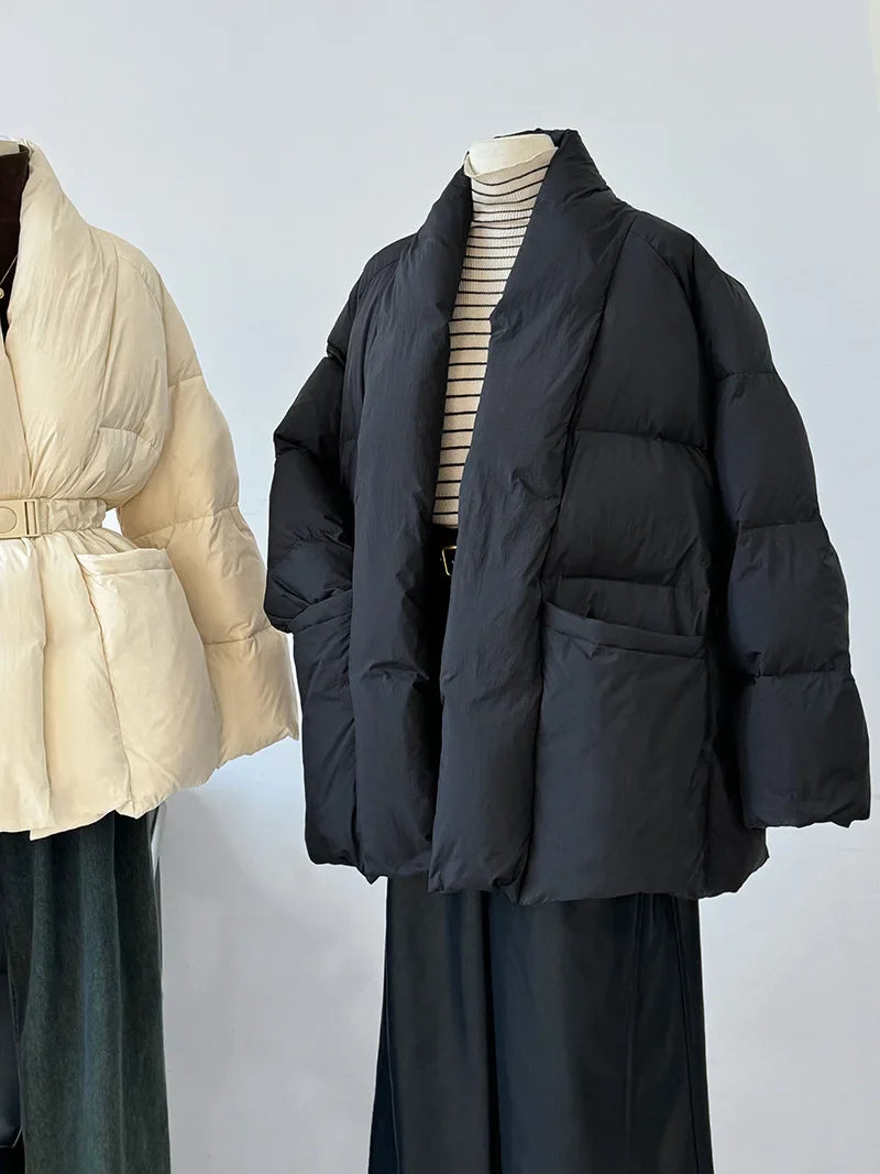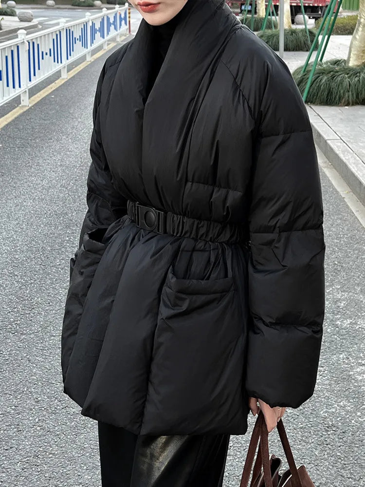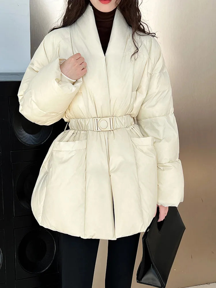 This down jacket from features a shawl collar, belted waist, and stuffed with white duck down for extra warmth. The long sleeves and thick polyester material make it perfect for the colder autumn/winter season. It is also categorized as a down jacket and has a V-neck collar.