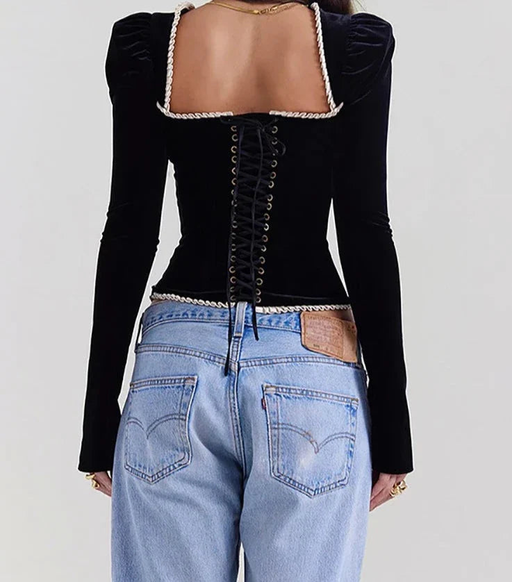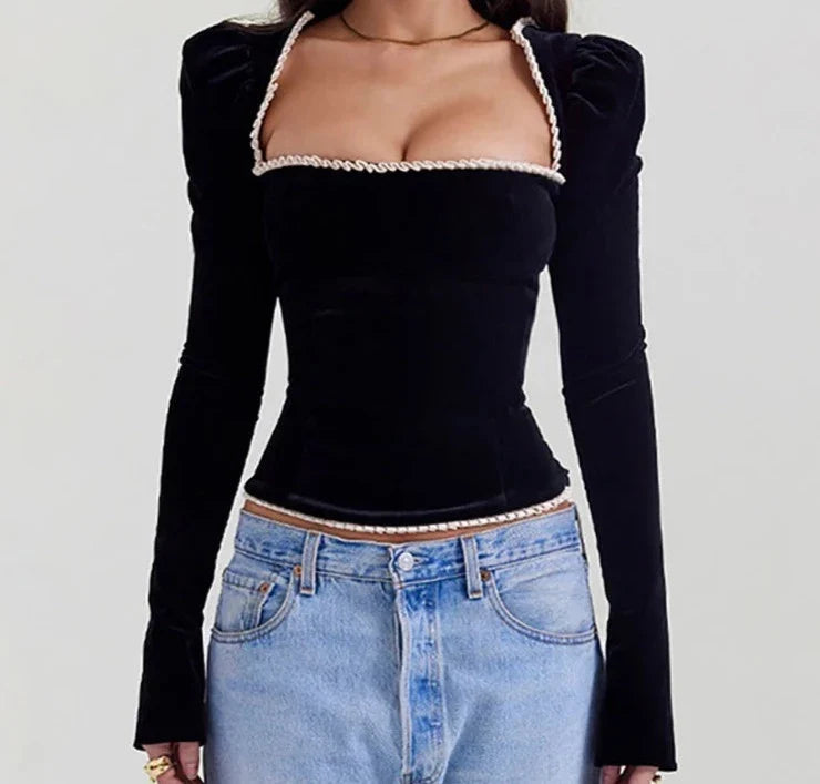 Johan D.Kiersten April 24, 2024Verified BuyerSo cuteThis is literally a dupe for the love and lemons one and a quarter of the cost. Super pretty on and not see through at all. Definitely recommend buying this one if you’re not trying to spend 80.00 plus on a bridal “morning of the wedding” outfit.Square Collar Bandage Black Long Sleeved Top Was this helpful? 0 0