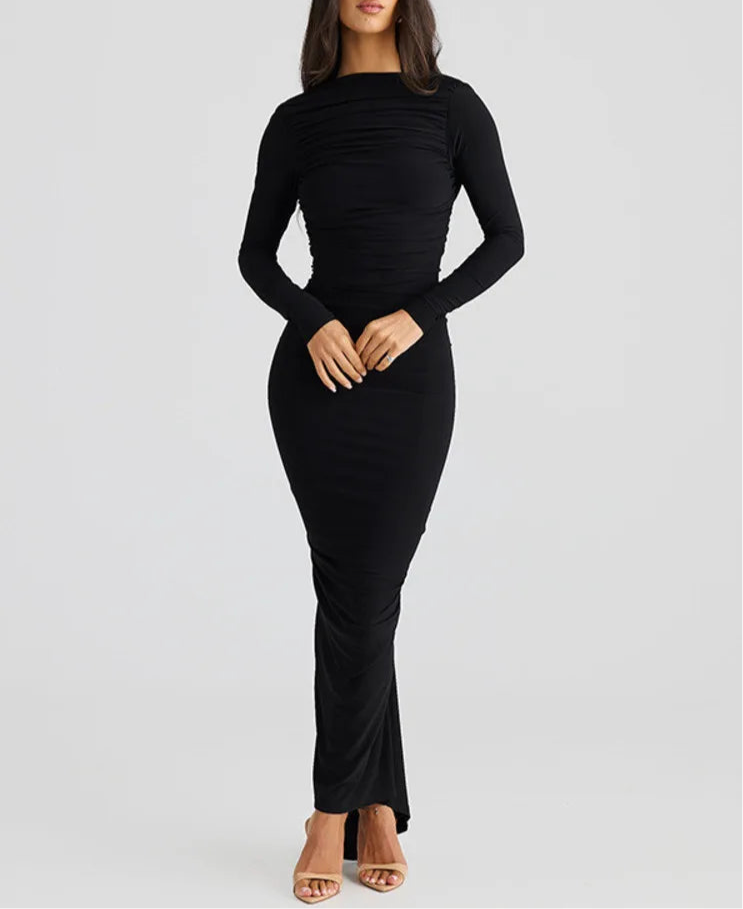 Kaylah M. Rivera February 10, 2023Verified BuyerCute, simple, flattering!Wore this for a date night with my boyfriend and it was the perfect little black dress for those colder nights. It is form fitting and hugs your body just right. I paired it with a pair of black booties and gold jewelry, perfect and simple. For reference I am 5’1, 130 pounds and the dress hit an inch or so above my knee. Also not see through.V Backless Long Sleeve Ruched Maxi Dress Was this helpful? 0 0