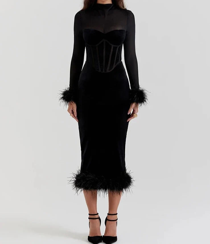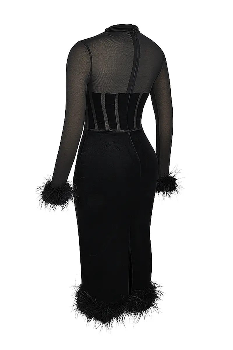 Velvet Long Sleeved Feather Midi Bodycon Dress features a corset-inspired silhouette crafted with luxurious velvet material and accented with a feathered wrist detail. The midi-length construction adds a timeless elegance to the piece.