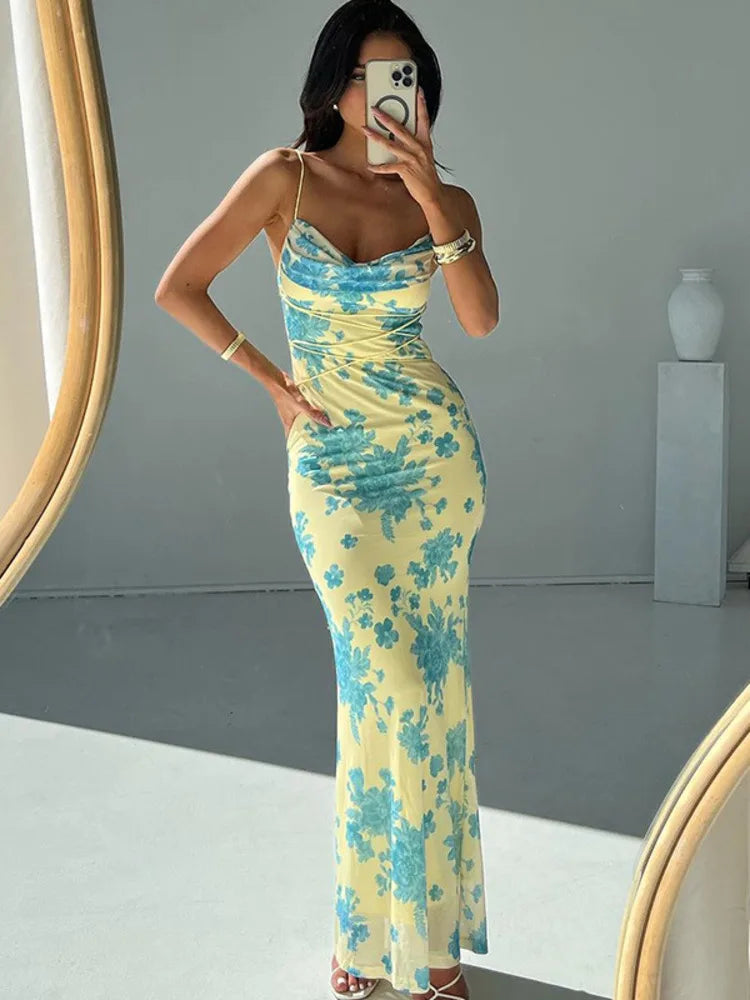 Get ready to turn heads in this stunning Elegant Spaghetti Strap Backless Print Maxi Dress! With its slim fit and sheath silhouette, it's perfectly designed to accentuate your curves. Its strapless neckline and backless design add an alluring touch to this sexy and flirty club party dress. Made with a blend of polyester and spandex, it's the perfect combination of comfort and style. Just slip it on over your head using the pullover spaghetti strap closure, and you'll be ready to hit the town in style.