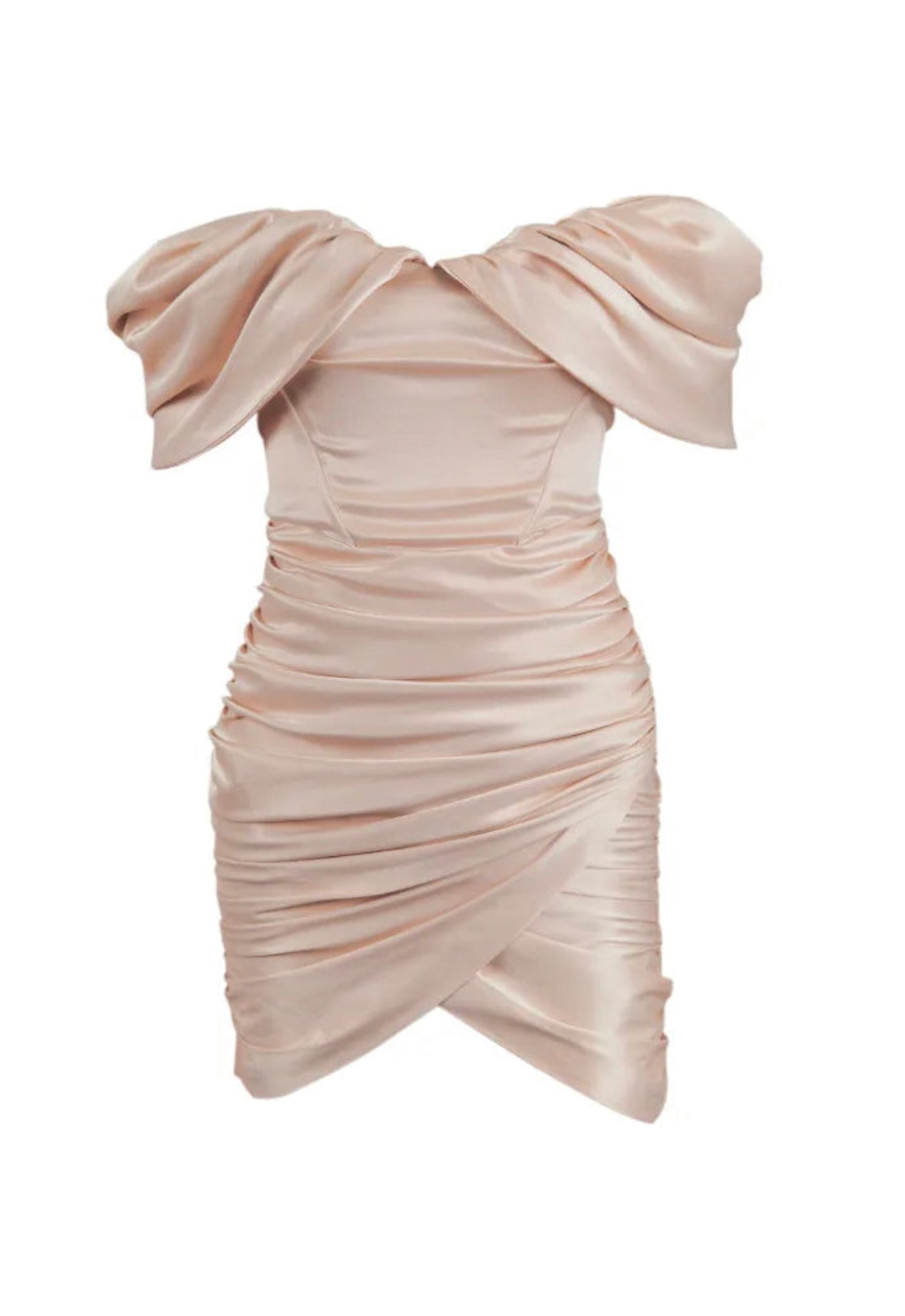 Prepare for the spotlight in luxe satin Mini dress, with an eye-catching off-the-shoulder style and ultra-feminine ruched detailing. A daring choice for an unforgettable date night.