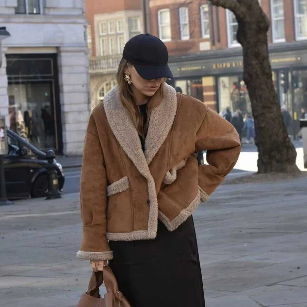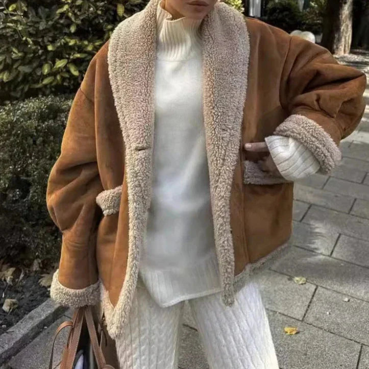 Elevate the style quotient of your wardrobe with the exquisite Autumn and Winter Warm Suede Jacket. Crafted from luxurious materials and suede, this casual oversize coat showcases a rich brown hue, perfect for the cooler seasons. The jacket features delicate pockets, a single-breasted closure, and a v-neck collar for added sophistication. With a full-length batwing sleeve, this jacket exudes an air of exclusivity, making it a must-have for any fashion-forward woman. Embrace the season in style with this premium coat.