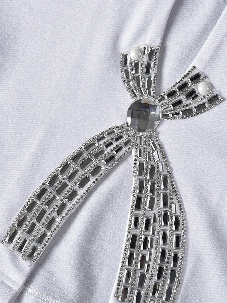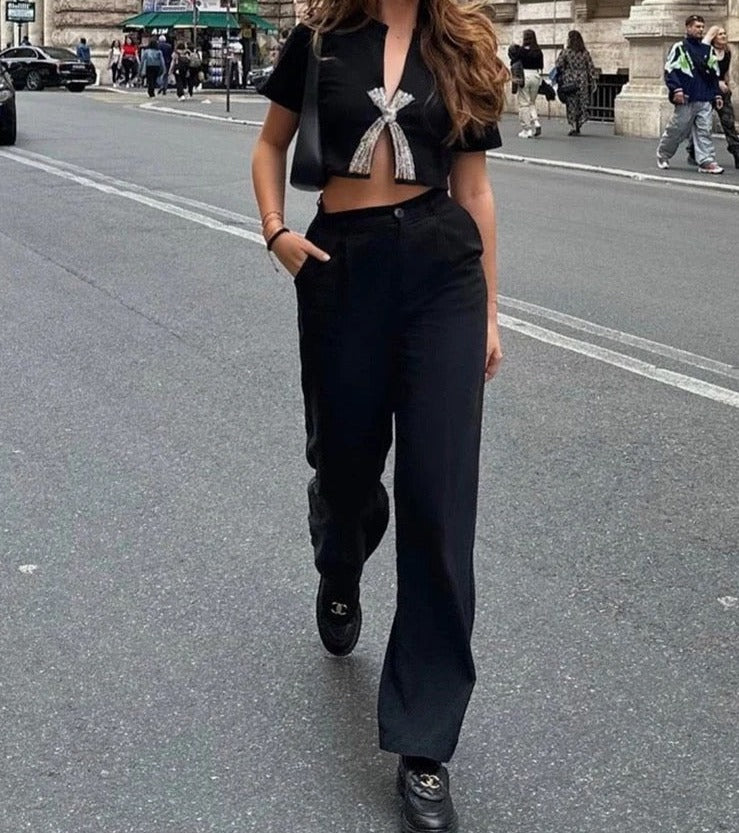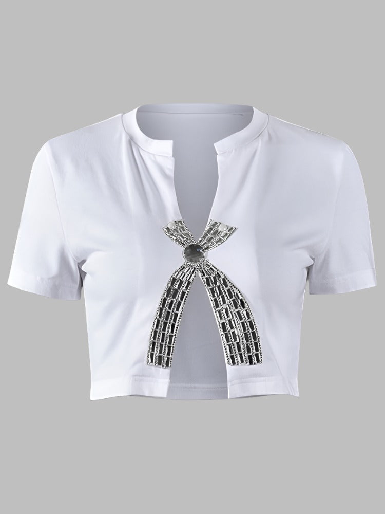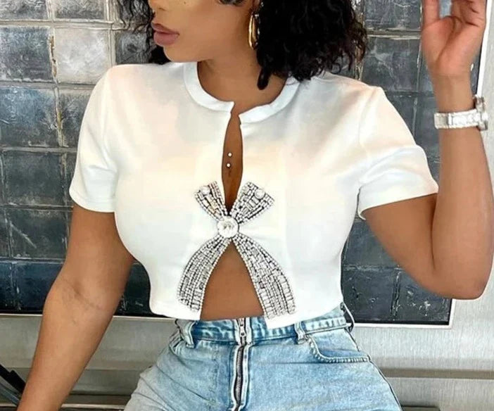 Looking for the perfect summer top? Look no further than our Open Split Tshirt! With rhinestone decoration, a low neckline, and a slim fit, these tops are guaranteed to make you stand out. The short length and short sleeves add a touch of sexiness, perfect for a girls' night out or hitting the high street. Made with a blend of polyester and spandex, these tops offer medium stretch for comfort. The solid color and woven fabric make it an ideal choice for any occasion. Get ready to turn heads in our trendy and versatile tops that promise to elevate your style game!
