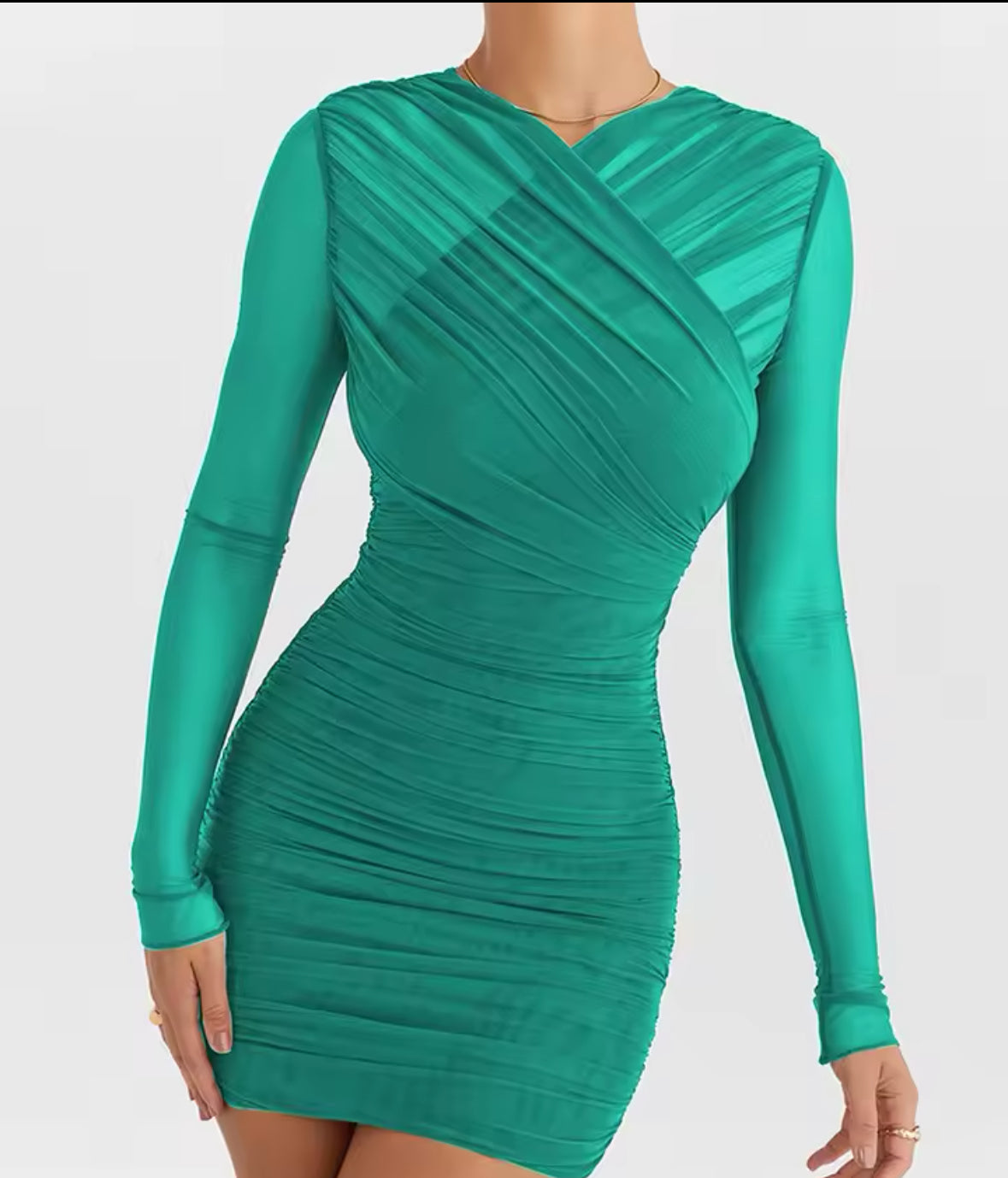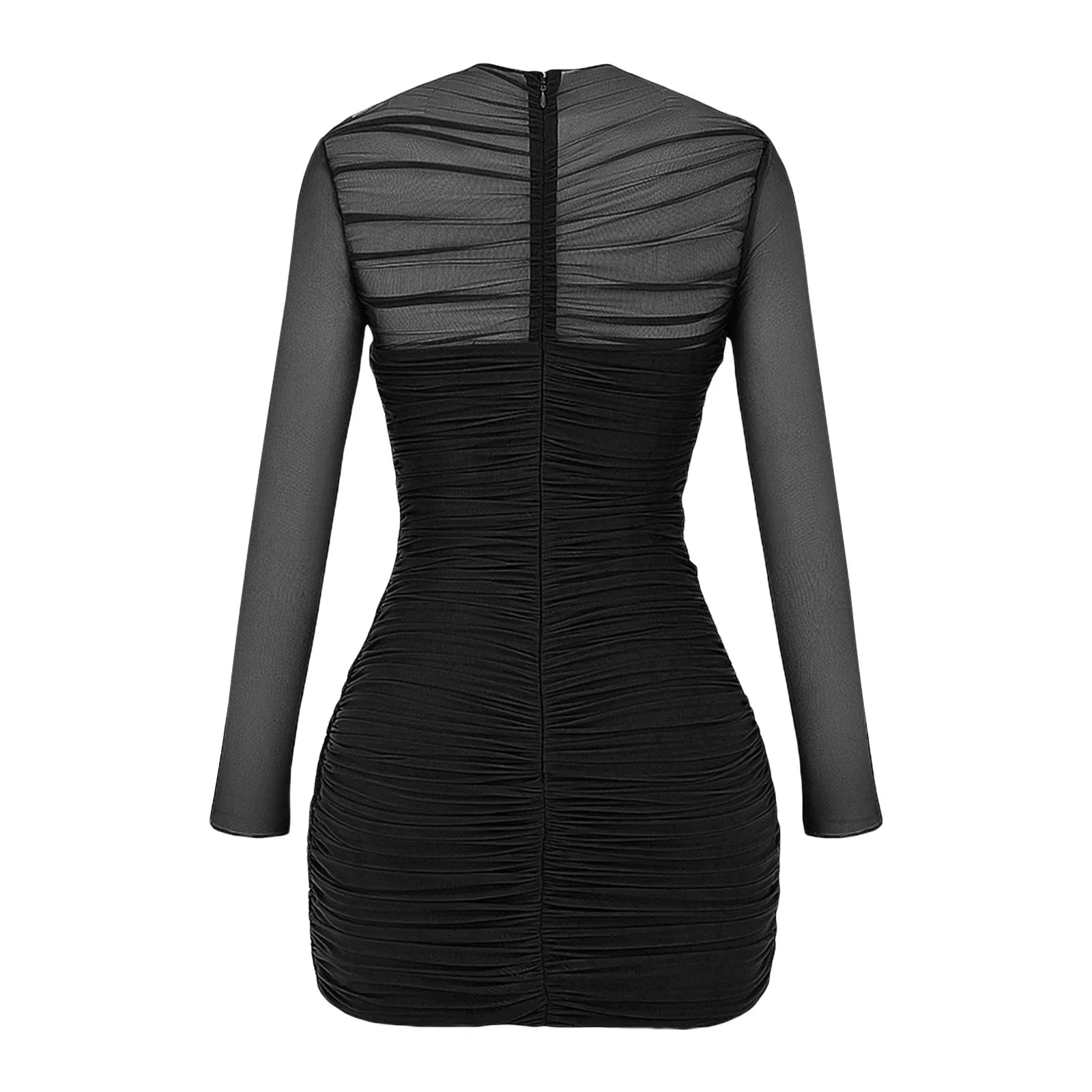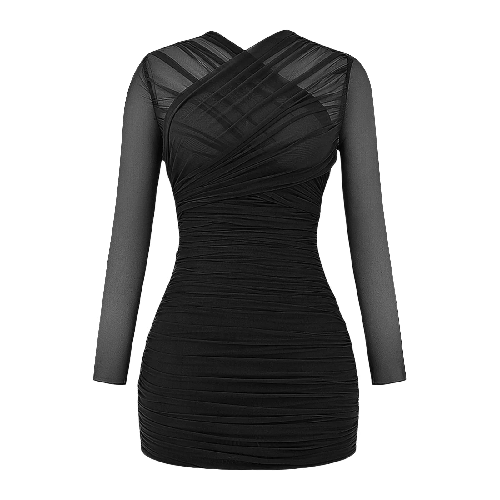 Ruched Mesh Long Sleeve Wrap Front Bodycon Dress